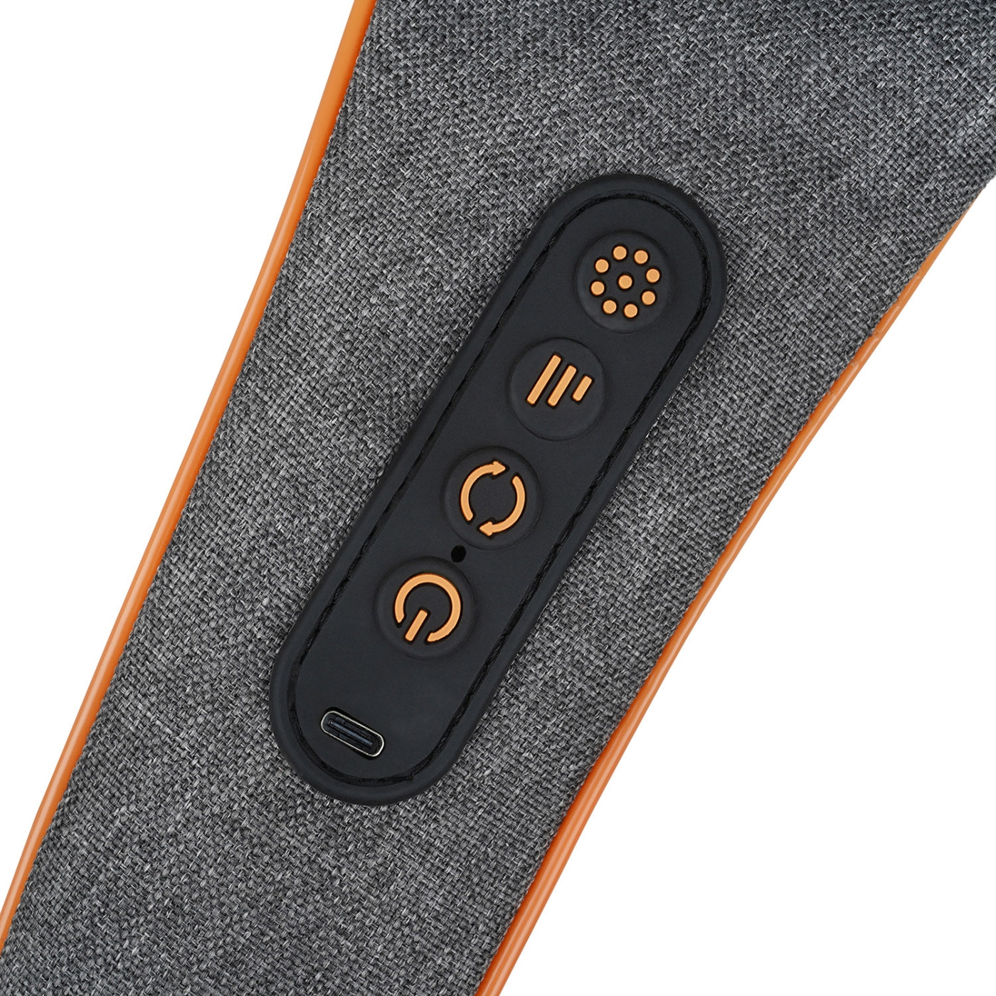 The device is equipped with two handgrips for pressure control and an additional button to adjust intensity. A strap with a clip secures the massager to your back, allowing hands-free use. Powered by a USB-C connection and an 1800mAh battery, it offers up to 40 minutes of cordless operation, making it ideal for use at home, in the office, or while traveling.