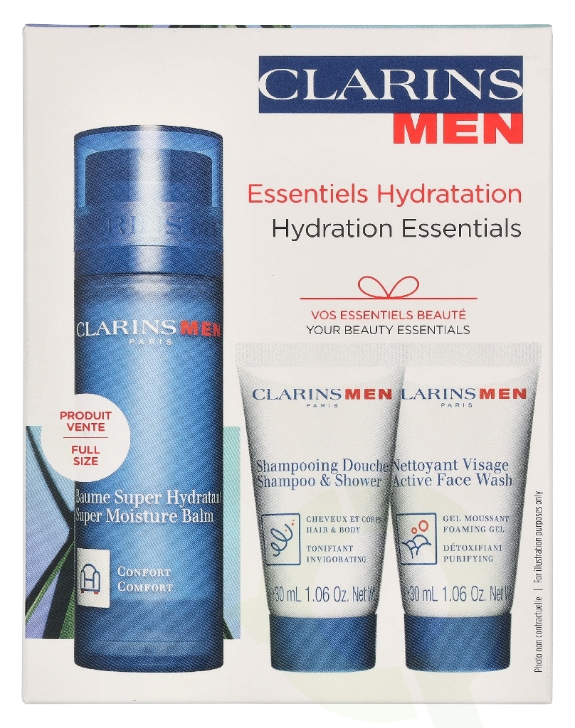 Clarins Men Hydration Essentials Set 110.9 ml Super Moisture Balm 50ml/Shampoo & Shower Gel 30ml/Facial Cleanser 30ml/Double Serum Eye 0,9ml