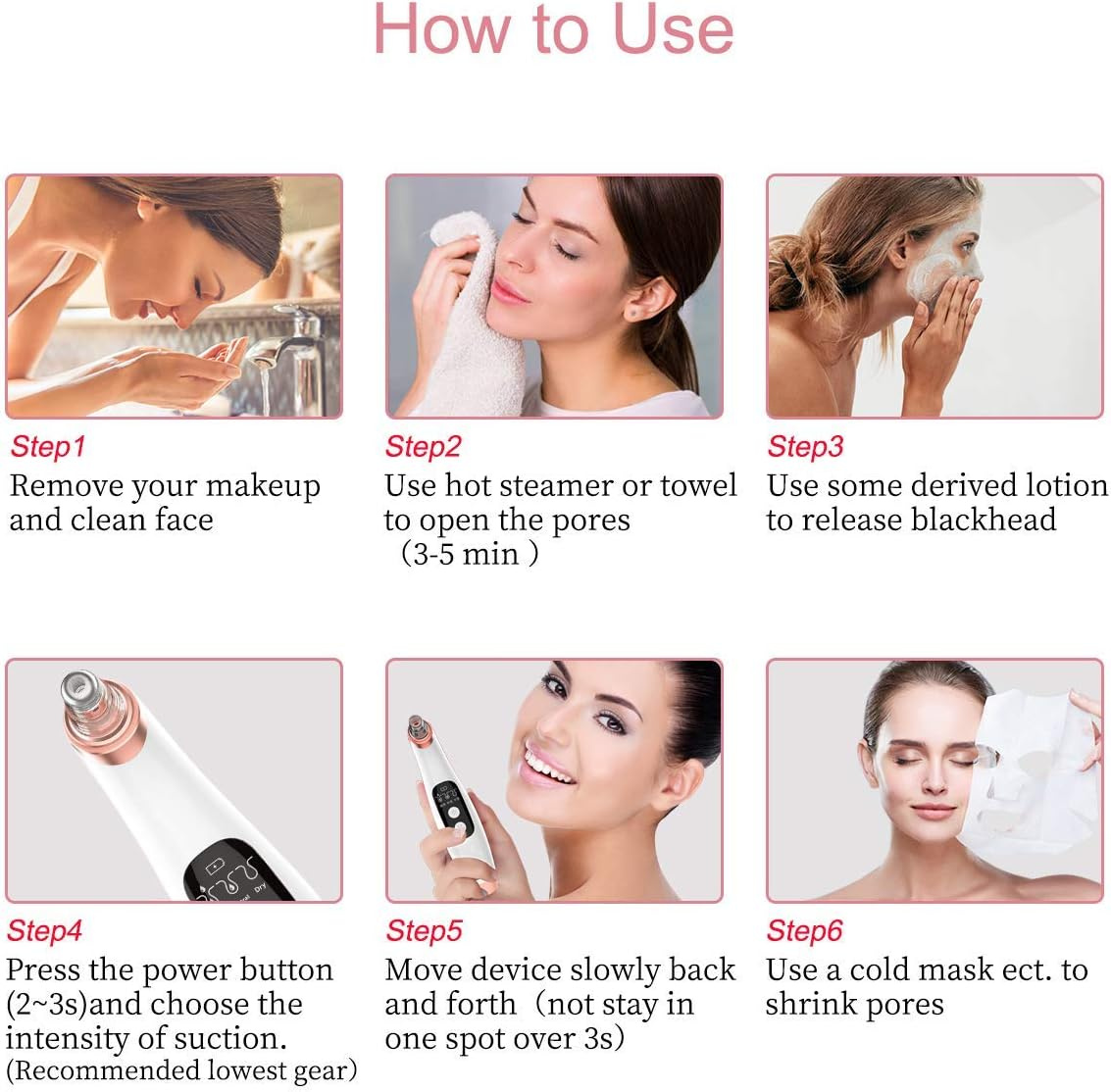 This pore cleaner cleans using a vacuum technology. 6 different heads included. The device has an LCD display that shows the battery status and the selected mode. The device has 3 intensity levels. Suitable for all skin types. 1.5 hours operating time. Charging time 5 hours. (Charged by USB.)