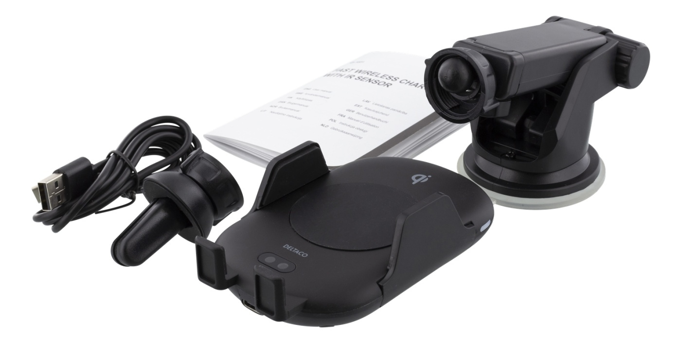 Wireless charger, extension arm with suction cup, mounting shoulder for AC-fan grill, USB-C charging cable 1m, Manual