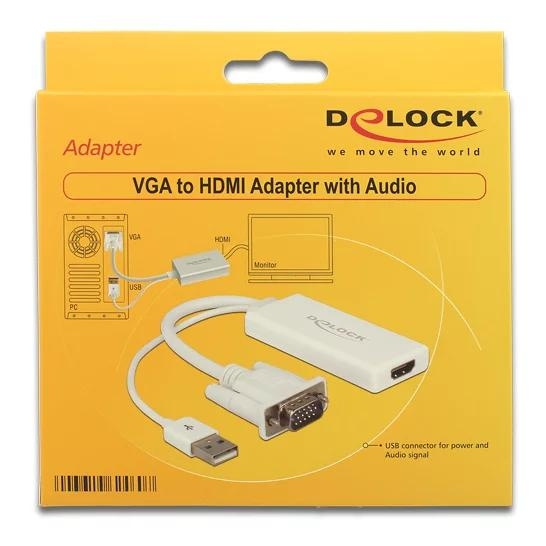 DeLOCK VGA to HDMI adapter with audio, HD15 male, USB 2.0 for audio and power, HDMI female, 0.25m, white