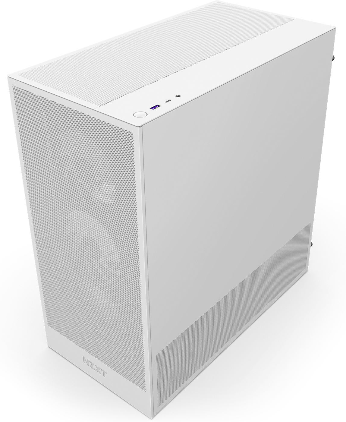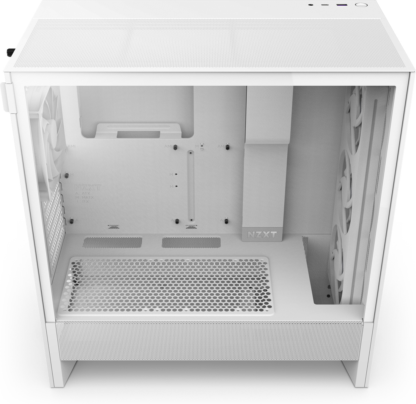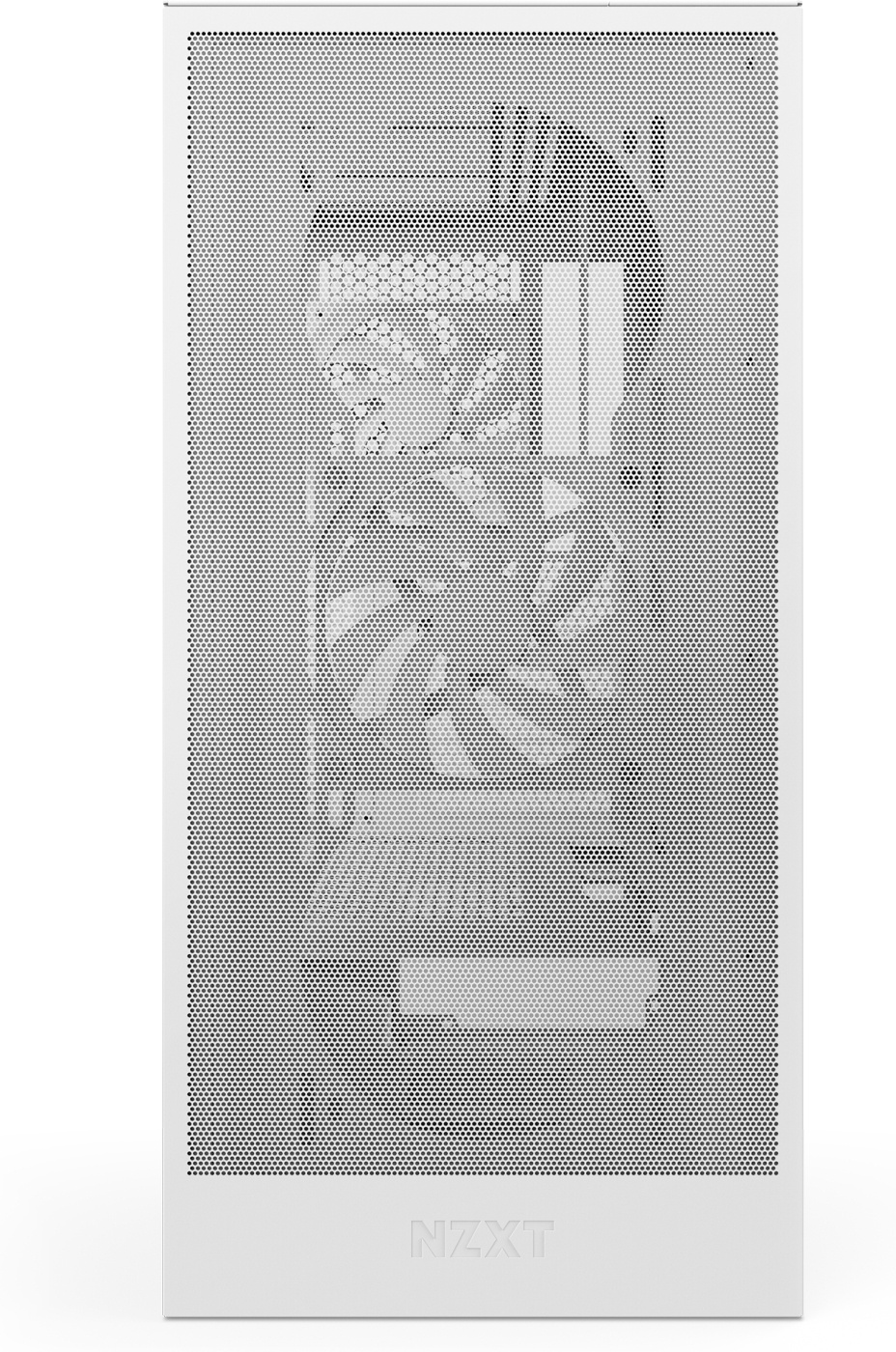 The power supply shroud is perforated on the sides and bottom, allowing for optimal air intake from two 120 mm fans (not included). It supports a 360 mm radiator at the front and a 240 mm radiator at the top, offering effective options for liquid cooling. A fine mesh on the top, front, and side panels maximizes airflow and effectively filters dust.