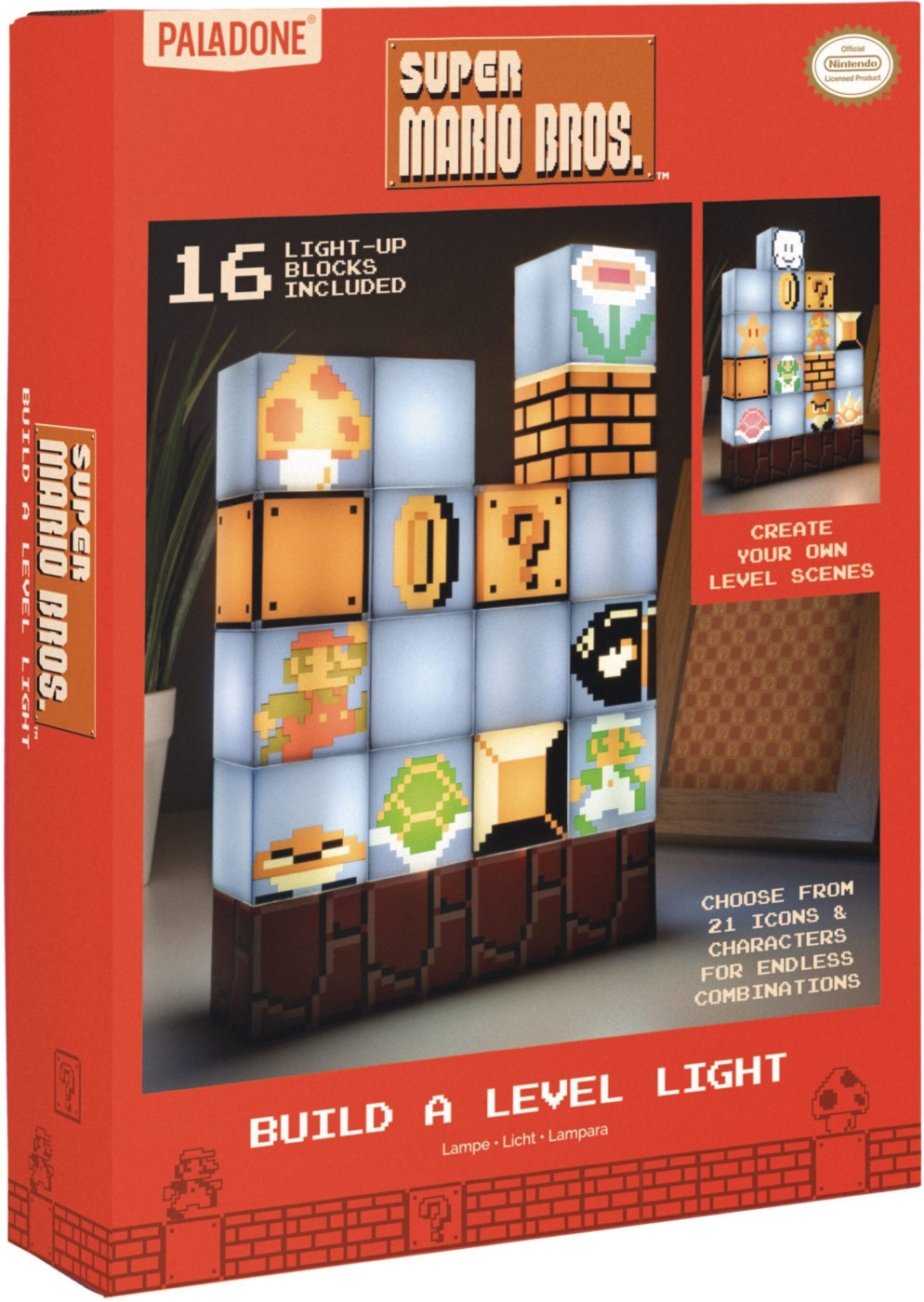 Ljuset tillverkat av Paladone har 16 belysta block som du kan ordna efter dina egna önskemål. Ljusblocken har välbekanta karaktärer och föremål från spelet. Du kan lägga till till ditt fält, till exempel, Mario eller Luigi, en eldblomma och ett mynt, och ett sköldpaddsskal. Lampan är 20 cm hög när de fyra blocken staplas på varandra.