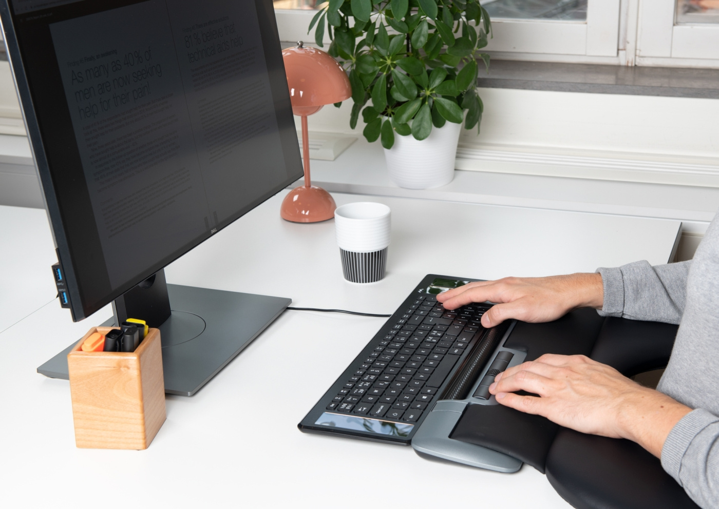MouseTrapper The mouse is positioned in front of the keyboard, creating a balanced working posture. Placing the mouse in front of the keyboard keeps your hands close to your body, allowing you to work ergonomically within your shoulder line. Working with the mouse inside the shoulder line reduces repetitive external rotation of the upper arm and internal rotation of the forearm, which typically occur during traditional mouse use and can cause repetitive strain injuries over the long term. MouseTrapper The soft wrist supports on the mouse reduce pressure on the neck, shoulder area, and arms.