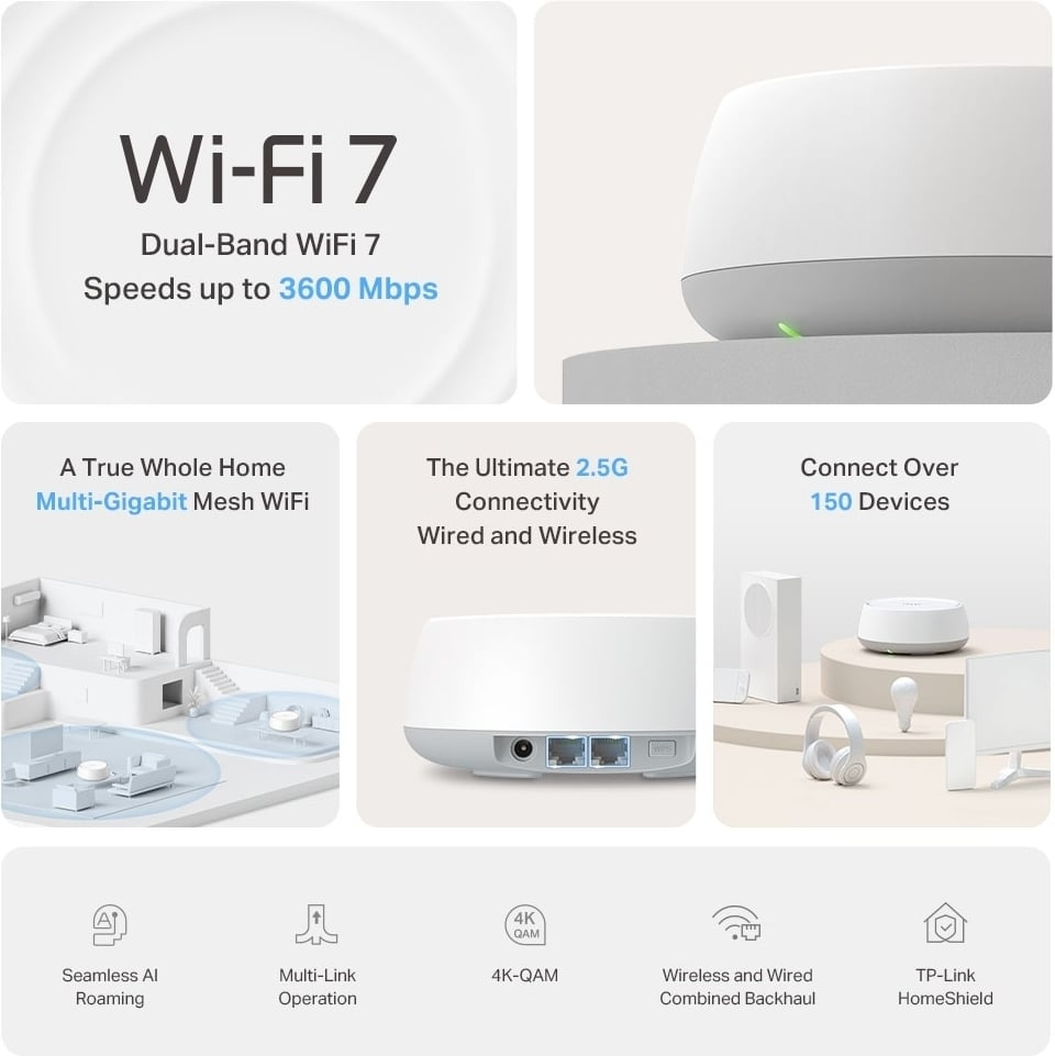 - Package contents: 3 x Deco BE25 Dual-Band WiFi 7 Mesh Router, 3 x AC power adapter, Ethernet cable, quick start guide