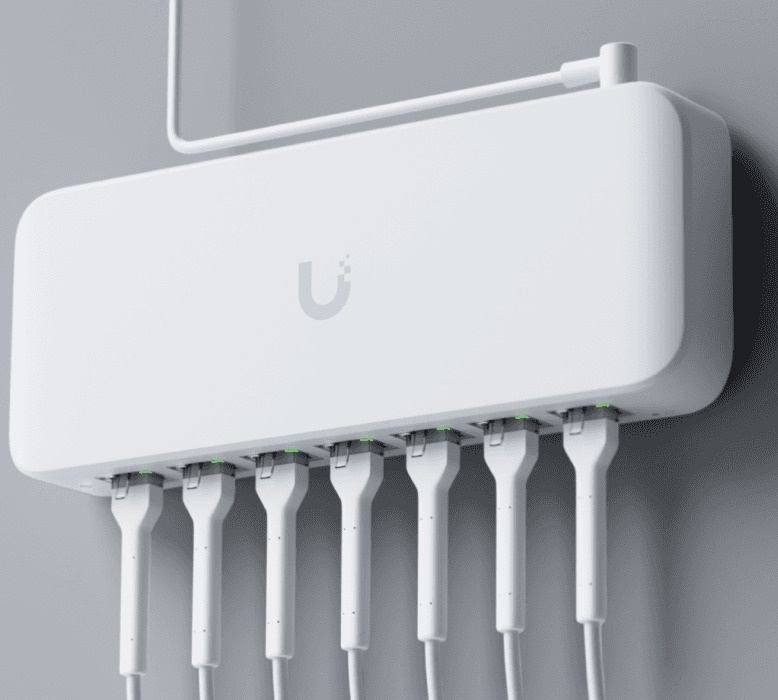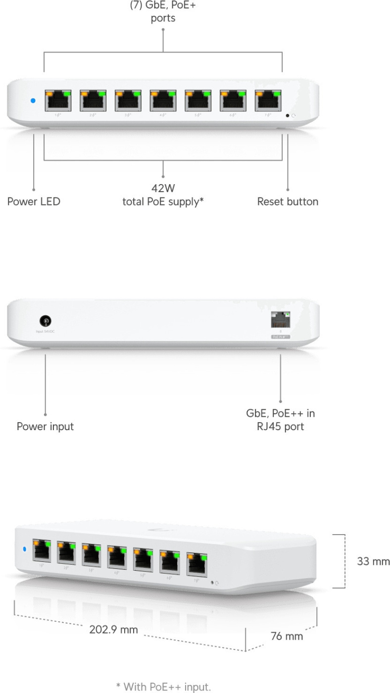 - 8 x Gigabit RJ-45 ports, including 7 x PoE+ Out and 1 x PoE++ In support