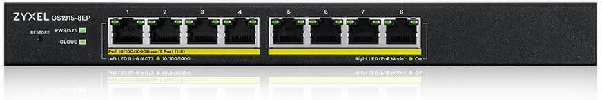 - Package contents: ZyXEL GS1915-8EP switch, power cord, wall mounting kit