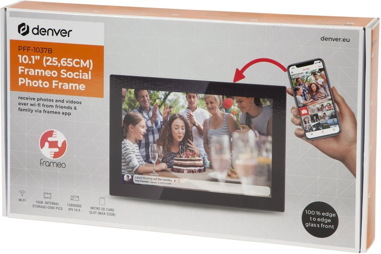 Använd denna digitala fotoram från Denver för att visa upp och dela foton. Du kan använda den digitala fotoramen som en vanlig fotoram, men med möjligheten att byta bild när man vill. Du kan till och med visa upp videor på den 10,1" stora pekskärmen. FRAMEO-applikationen, som kommer förinstallerad, gör det enkelt att dela med sig och visa upp bilder på vänner, familj, husdjur och roliga minnen. Denver 10,1” digital Wi-Fi Fotoram är perfekt att ha i sitt vardagsrum eller sovrum.