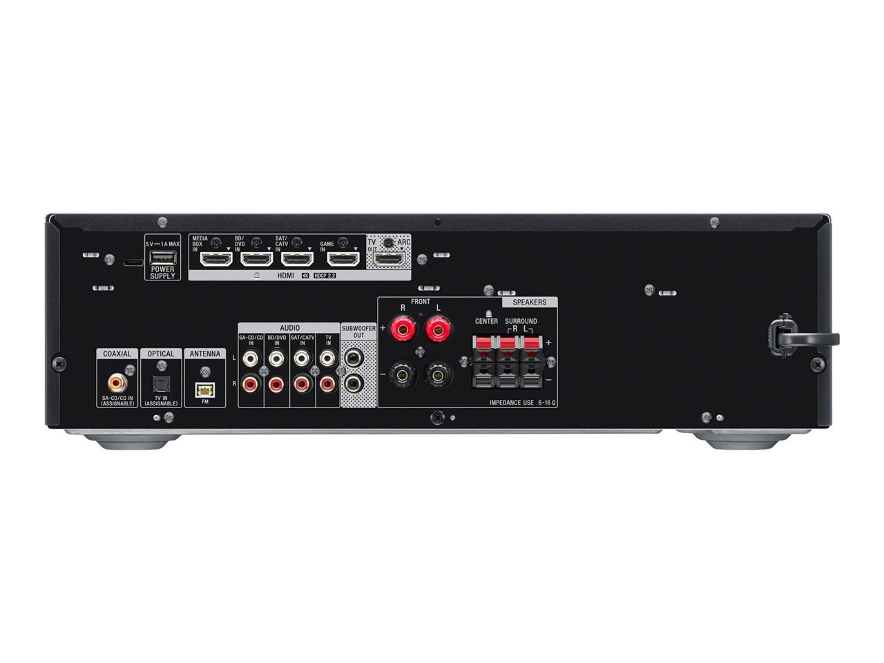 En riktigt dynamisk installation av hemunderhållning. Det finns fyra HDMI-ingångar och en utgång plus optiska/koaxiala digitala och analoga ljudanslutningar så att du enkelt kan ansluta din tv, UHD Blu-ray Disc-spelare, spelkonsol med mera.