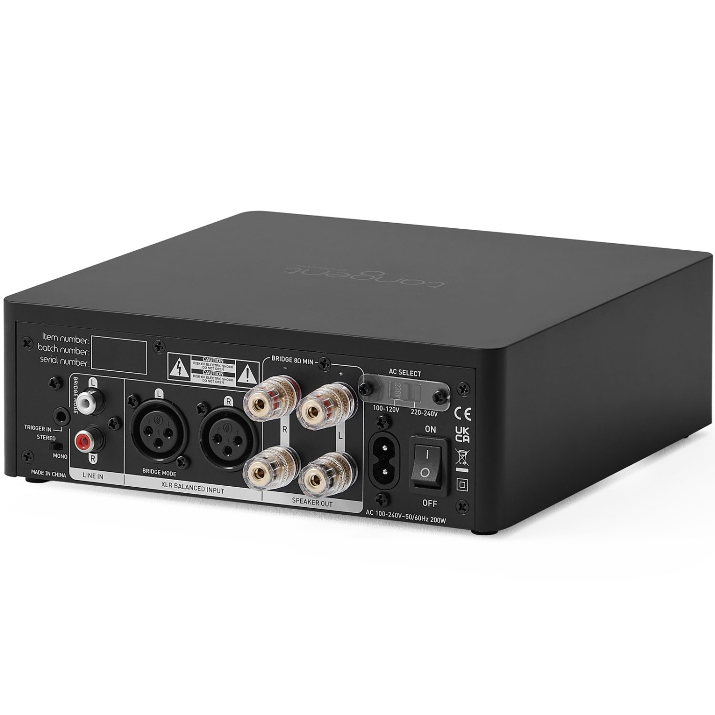 Kompakt effektförstärkare i satinsvart. Levererar 2 x 100 W stereo eller 1 x 200 W bryggad, med RCA/XLR-ingångar och 12V-trigger – perfekt för användning med Tangent PreAmp III eller andra förförstärkare