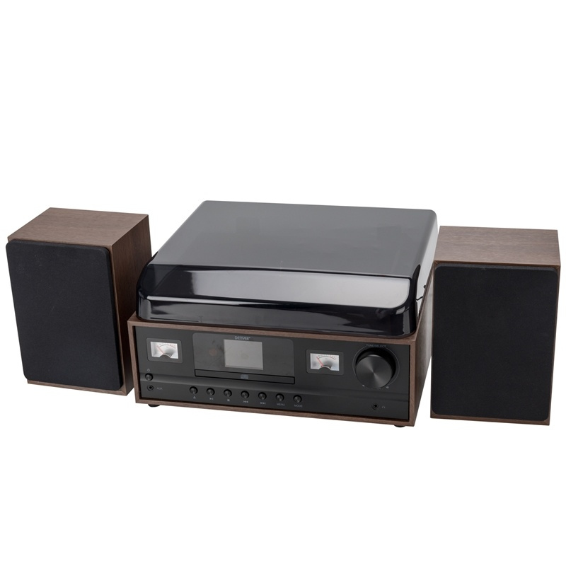Vinyl-spelare, Radio och CD. Streama musik från mobil via Bluetooth. Fräcka VU-mätare på framsidan. Hörlursuttag och AUX-ingång. Fjärrkontroll ingår liksom högtalare.