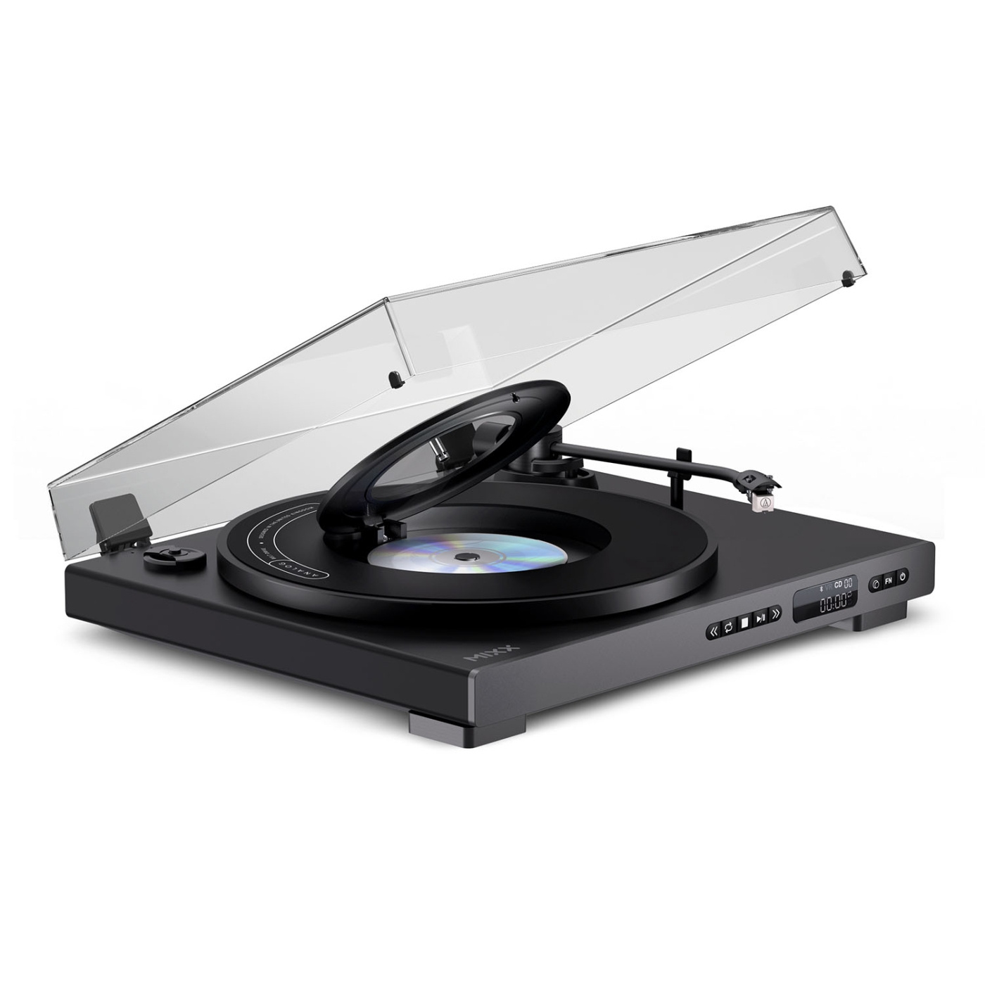 The Analog Plus is a sleek, fully automatic turntable with an integrated CD player, perfect for reviving your music collection. It offers smooth 33/45 RPM vinyl playback with full tonearm automation, making listening effortless. The system allows you to transmit audio wirelessly via Bluetooth or connect to your existing sound system using AUX out. With features like track number and time display, skip and repeat functions, and playback controls on both the unit and the included IR remote, it combines retro style with modern functionality.