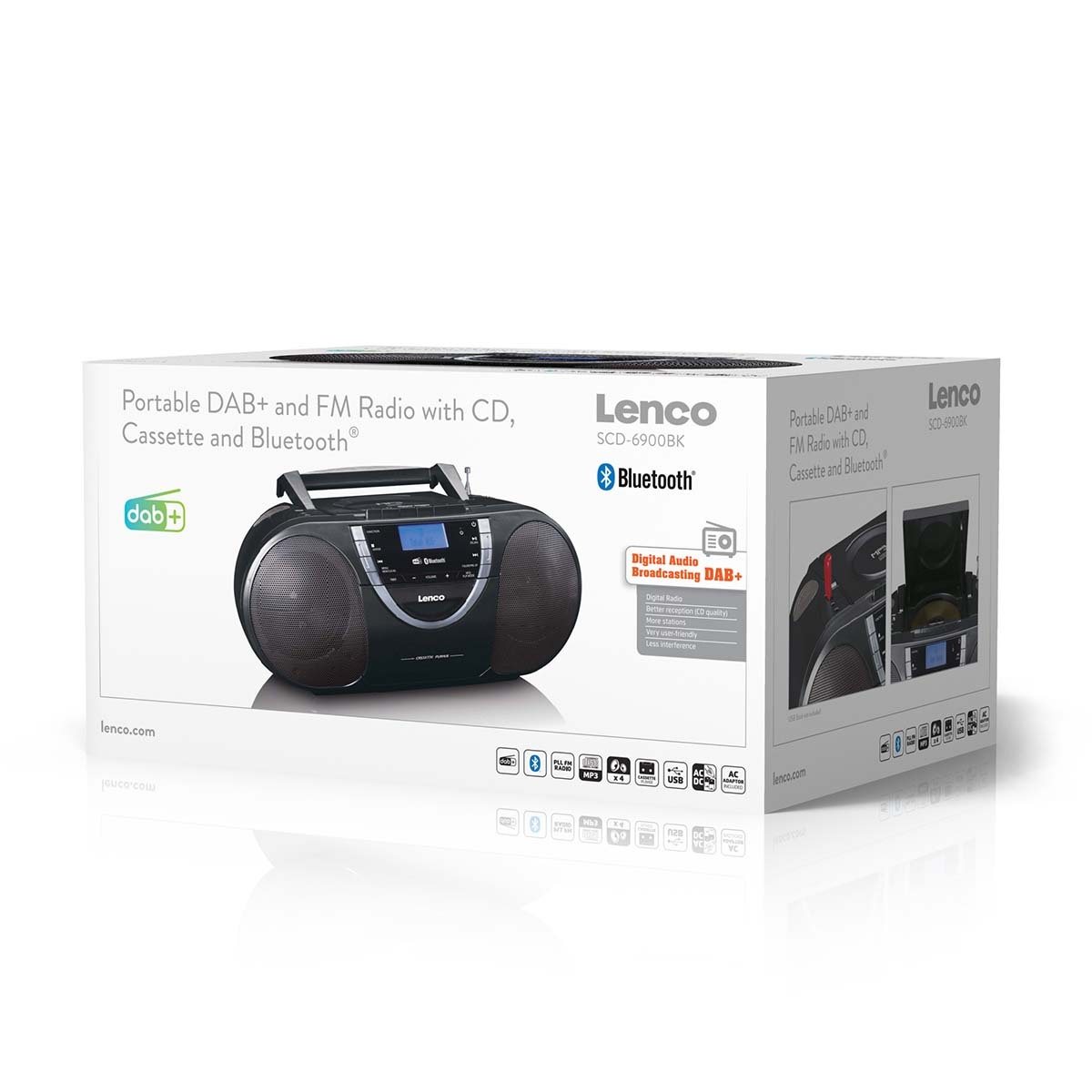 The portable boombox works on (8 type C) batteries, and also on mains power with included power lead. Therefore, you can play your favourite music anywhere with the Lenco SCD-6900BK.
