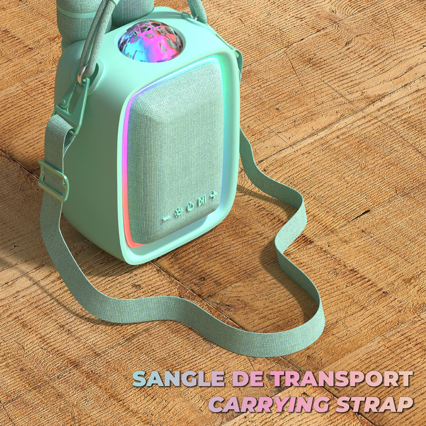 A portable karaoke speaker from Mobility on Board with a playful design for family fun.