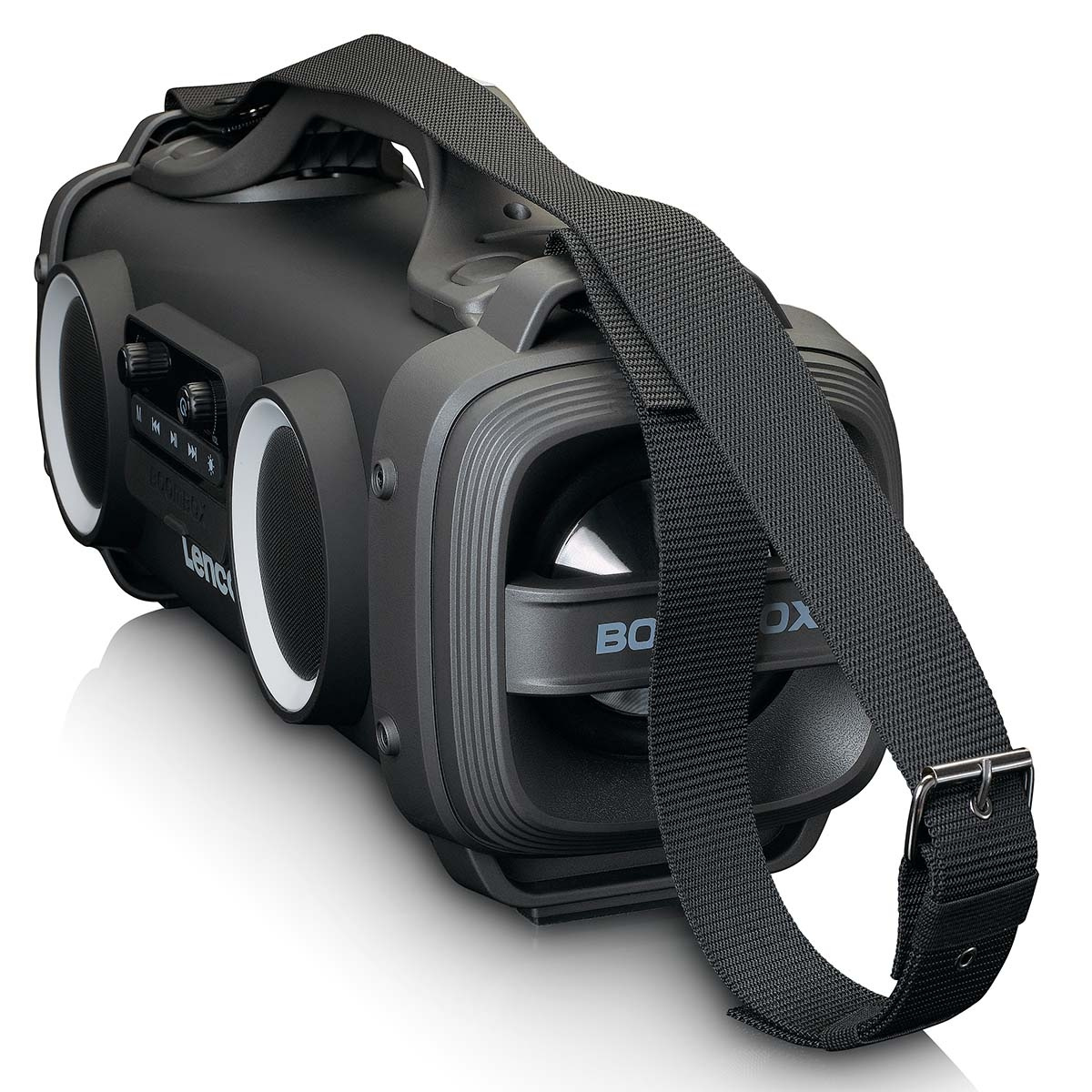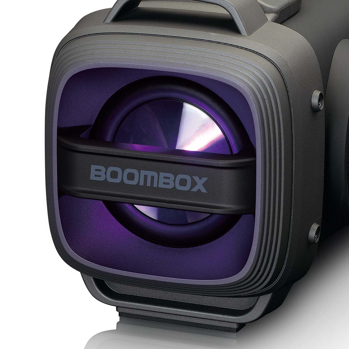 The SPR-200BK is perfect for a party indoors, or outdoors because this portable boombox has a rechargeable battery so you can easily take it with you wherever you go. Other key features are an audio equaliser, bass adjustment, shoulder strap and Lighting effects.