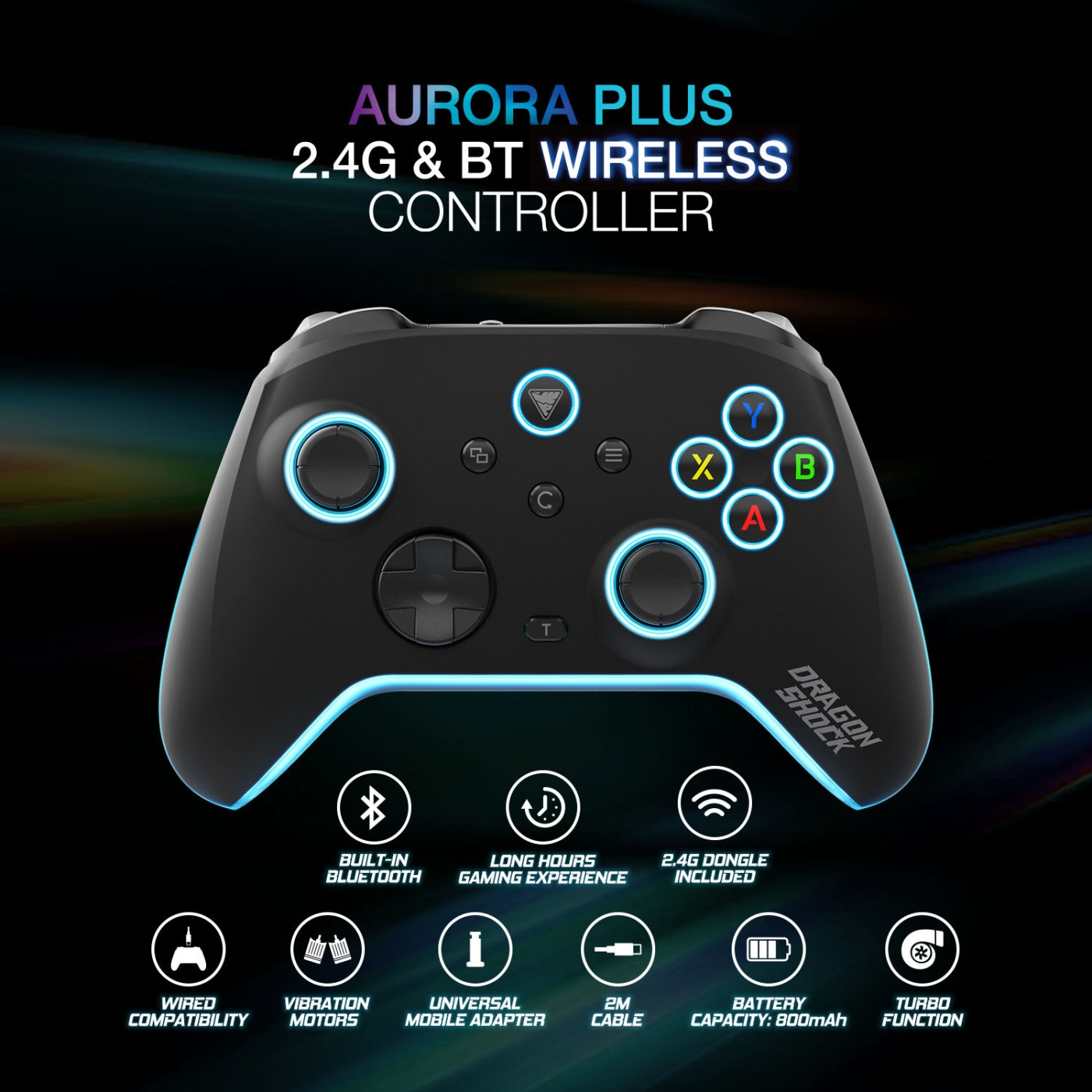 Enhance your gaming experience with the Aurora+ controller, designed for seamless performance across various platforms. This controller offers the freedom of 2.4G wireless connectivity and Bluetooth technology, allowing you to enjoy gaming without the hassle of wires. Its ergonomic design, combined with vibration motors, ensures a comfortable and immersive gaming experience. Additionally, the RGB lighting feature allows you to personalize your setup to match your style.
