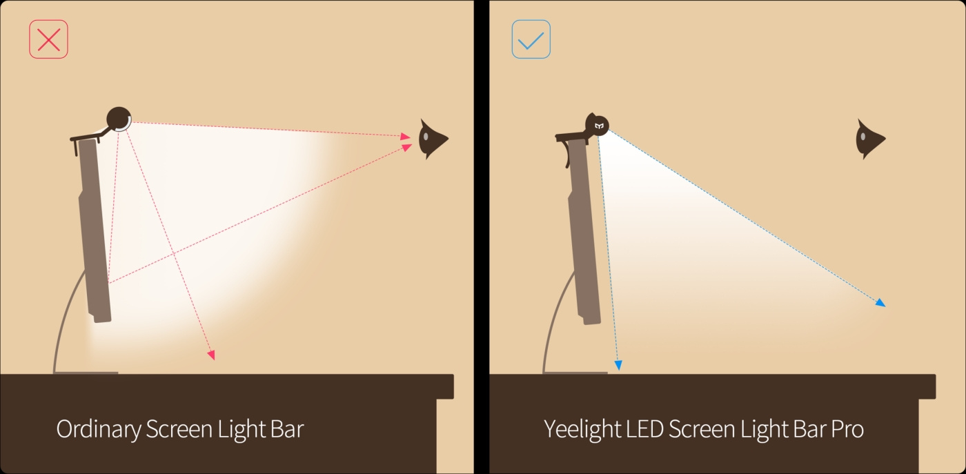 Yeelight LED Screen Light Bar Pro, installerad på toppen av datorskärmen, lyser upp skrivbordets framsida och datorskärmen stilfullt och jämnt med mångsidigt justerbart LED-ljus. Lampan är enkel att installera på både raka och böjda skärmar och den kan även kopplas direkt till en dators usb-anslutning.