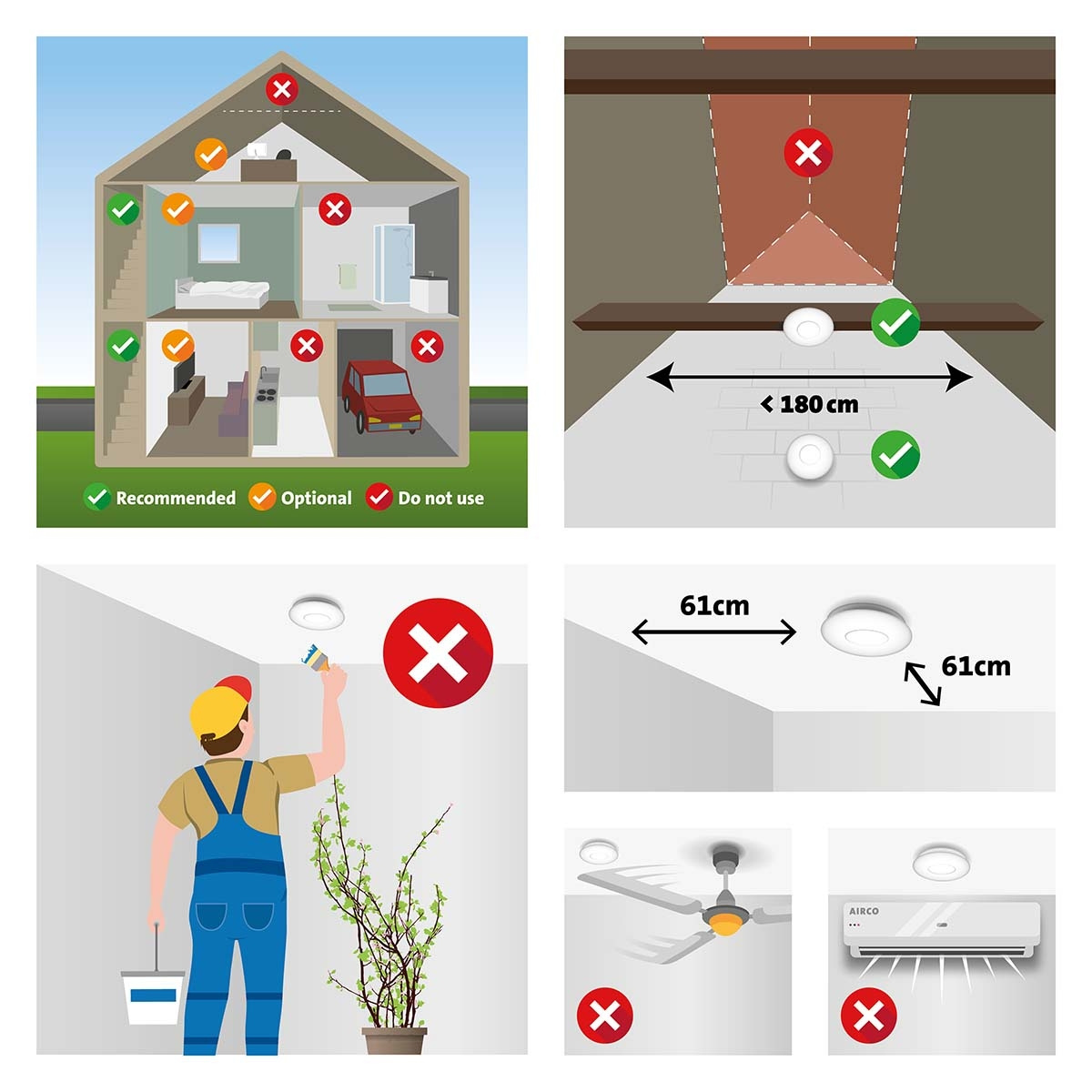 This compact smoke detector from Alecto is suitable for wall and ceiling mounting and is easy to install in the desired location. To make it even easier, it comes with a mounting base, screws and plugs. As soon as the smoke detector is clicked onto the mounting plate, the detector is activated. The best places to place smoke detectors are in the hallway or upstairs landing. These are often the escape routes if a fire breaks out in the house. If you want maximum security, install a smoke detector in every room where a fire could start. The SA300 is also available in a set of 2 smoke detectors, the SA300 DUO.