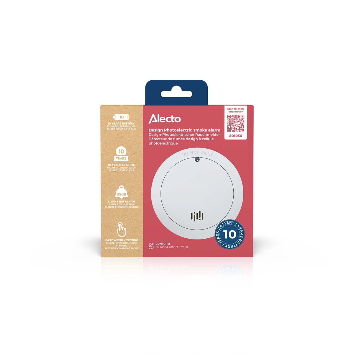 If there is a fire, the SD1030 will advise you promptly with a very loud alarm. If the fire is small and you manage to put it out, you can manually turn off the alarm. It is advisable to test your smoke detectors often, and you use the same button for this. For extra easy use and safety, the entire front is the time-out / hush / test and reset button.