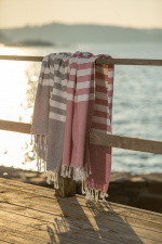 Hamam Morhult med vita ränder ger en klassisk tidlös stil. Badlakanet har fransar på kortsidorna, är tillverkad i 100% bomull och kommer i fem färger. Tar liten plats och kan även användas som picknicfilt, duk, eller som ett klädesplagg.