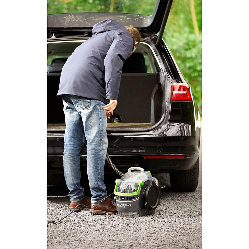 BISSELL SpotClean Pet Pro helps remove stains from almost any carpeted surface using water, BISSELL solution and hand-held cleaning tools with powerful suction.