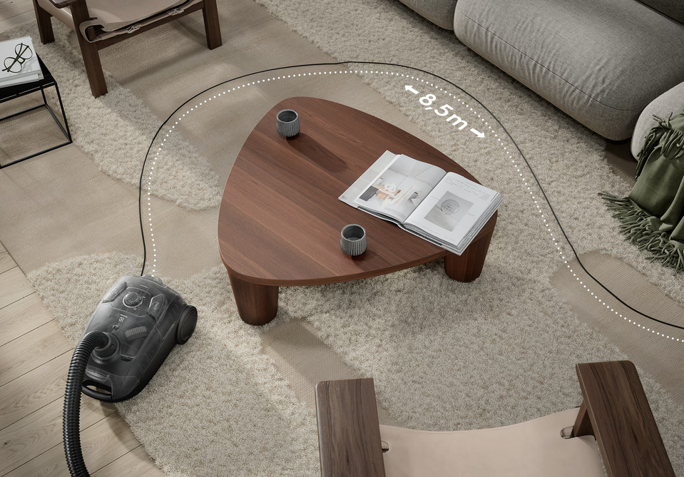 This ergonomic vacuum allows you to clean up to 72 square meters without changing power outlets. Thanks to the telescopic tube, large wheels, and 8.5-meter reach, you can move smoothly and clean without interruption.