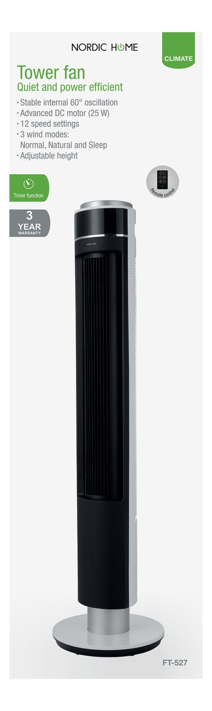 FT-527 from NORDIC HOME is a quiet and energy efficient tower fan with 12 speed settings. Controll the fan via the stylish controll panel with 6 buttons or use the included remote effortlessly from your sofa or bed. FT-527 can be adjusted in height from 112 to 128 cm, for a customizable air flow. Perfect to have in the bedroom during hot summer nights.