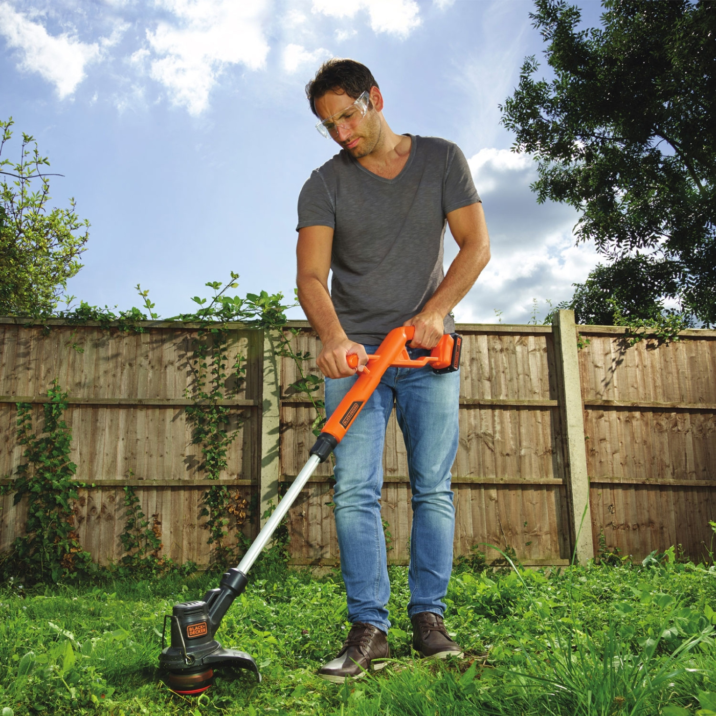 Med den batteridrivna grästrimmern får du en frihet som gör att du kan röra dig fritt trimma din trädgård. 18 volts-systemet från Black & Decker gör även att du kan använda batteriet till Black & Deckers andra batteridrivna produkter som driv på samma volt.