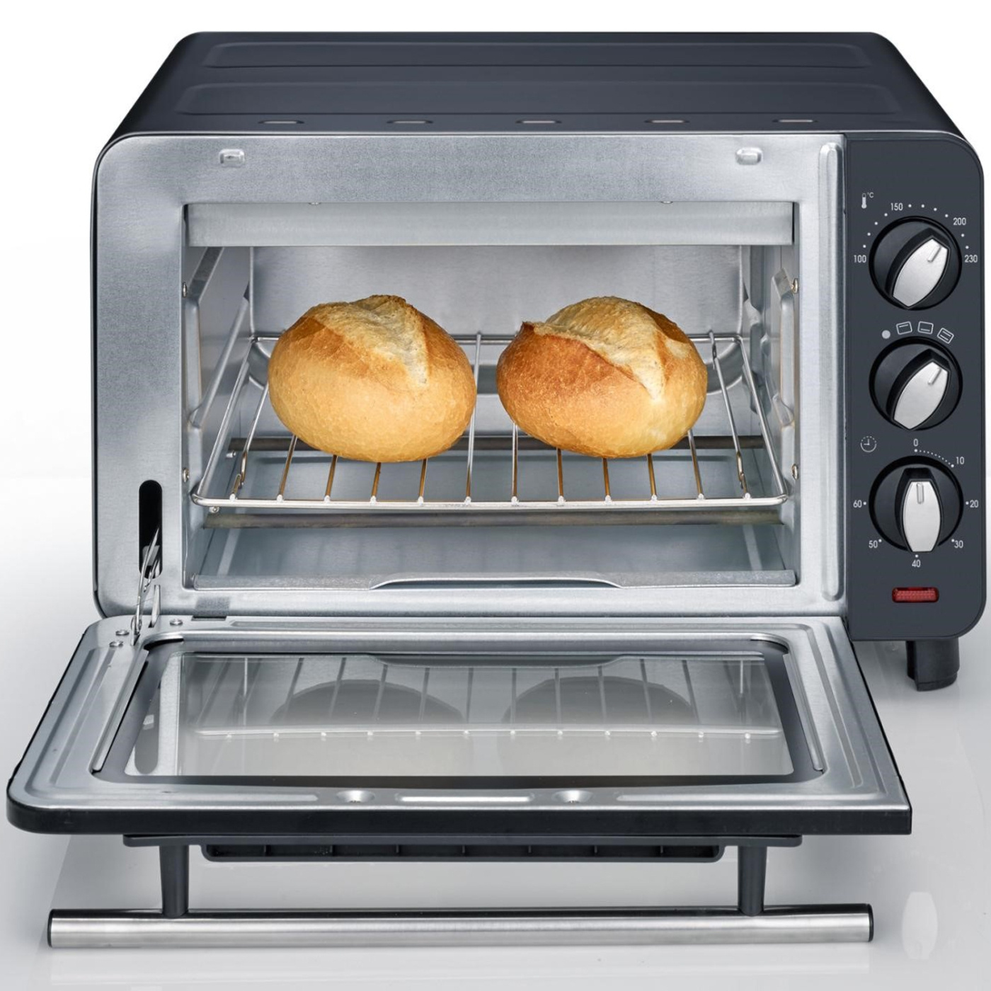 Det ingår både grillgaller och bakplåt för enkel användning. Miniugnen har även en 60 minuters timer med en akustisk signal. Två olika nivåer att ställa gallret på i botten av miniugnen ligger det en smulbricka för enkel rengöring.