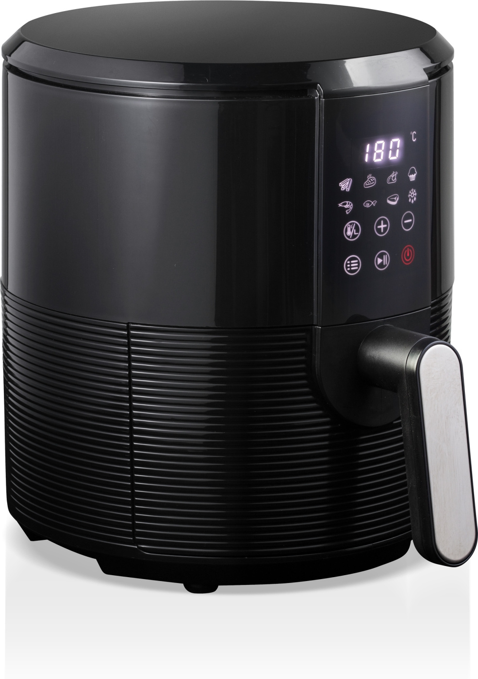 8 förinställda program: för pommes frites, biffar, kycklingnuggets, kakor, räkor, fisk, grönsaker och upptining. Det förinstallerade programmet inkluderar gräddningstemperatur och tid