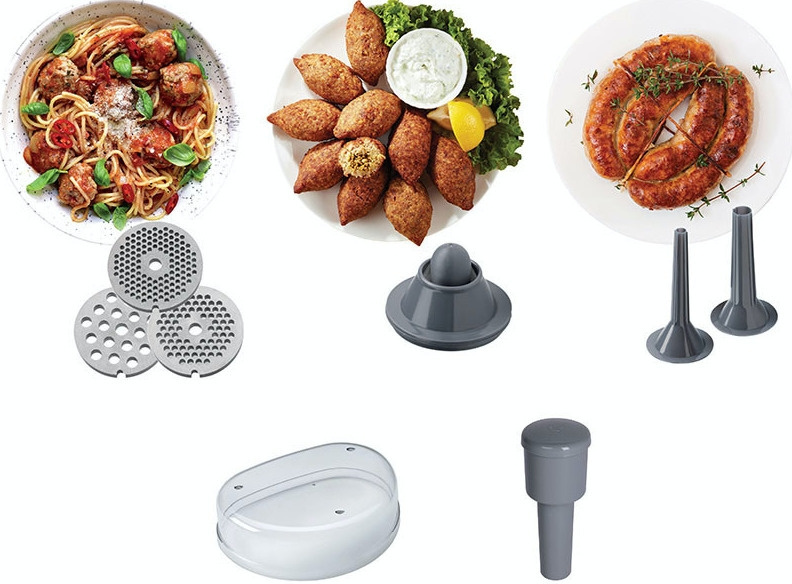 With the Kenwood MG700 meat grinder you can grind raw or cooked meat as well as fish, chicken, nuts or vegetables. The powerful 2000W motor of the Kenwood MG700 meat grinder processes up to 3kg of meat per minute, which is why the machine has gained popularity among hunting parties. The meat grinder is equipped with a reversing switch, which allows you to easily remove the small and often jammed membranes of game. The meat grinder is supplied with a high-quality steel cutting blade and three perforated plates: fine perforated plate 3mm, semi-rough perforated plate 4.5mm and rough perforated plate 8mm. The sales package also includes sausage and kebab hoppers. The sausage funnels are used to make delicious raw sausages. You can make sausages with exactly the ingredients you want and season them to your liking. Fresh herbs and the right spices complete the taste experience. There are two sausage sliders, one for thinner and one for thicker salt. The kebab funnels make it quick and easy to prepare tasty lamb kebabs.