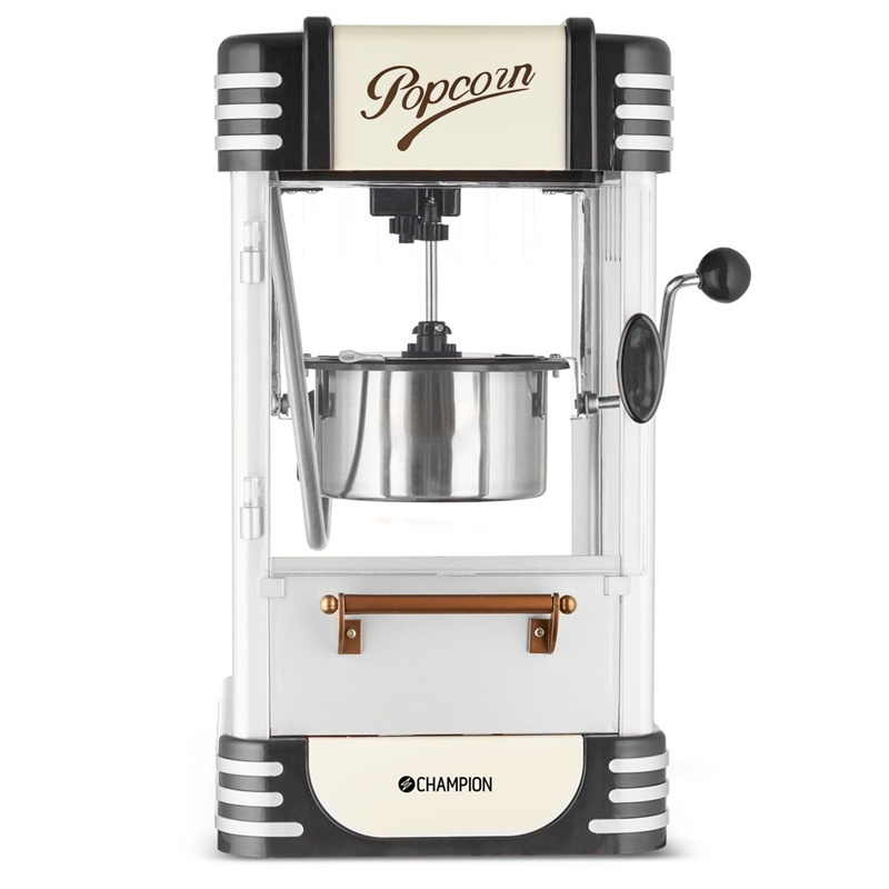 Champion popcornmaskin Retro är för dig som vill göra goda popcorn med biografkänsla hemma. Höj stämningen vid hemmabiokvällen, festen eller barnkalaset. Maskinen klara även det stora sällskapet tack vare den väl tilltagna kastrullen. Maskinens fönster och belysning gör det enkelt följa poppningen och på ett par minuter har du krispigt goda popcorn klara.