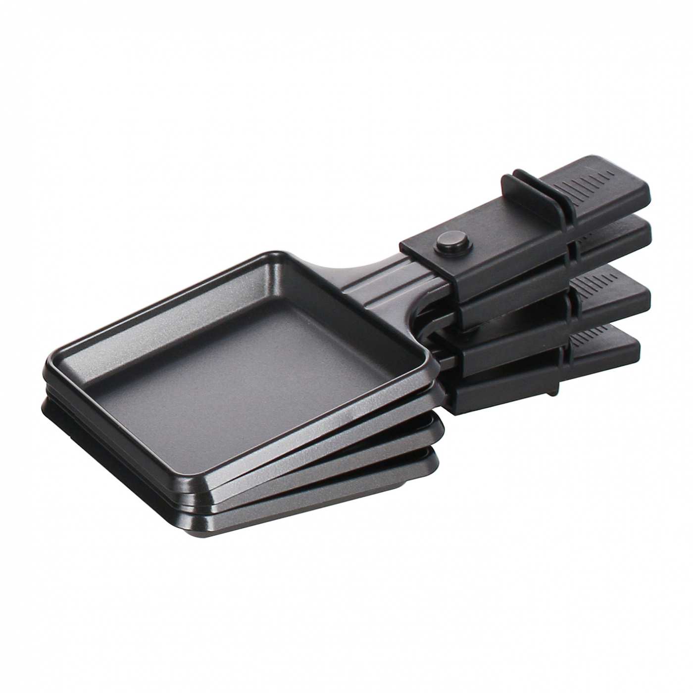 Designen är snygg i svart med en övre praktisk grillyta på 21 x 21 cm och 4 platser för grillspadar och smältning av tillbehör. Non-stickbeläggningen gör både grillningen och smältningen smidig och grillspadarna har praktiska handtag att hålla i. Raclettegrillen är dessutom väldigt lätt att rengöra och de stabila antiglidfötterna håller grillen tryggt på plats under användningen.