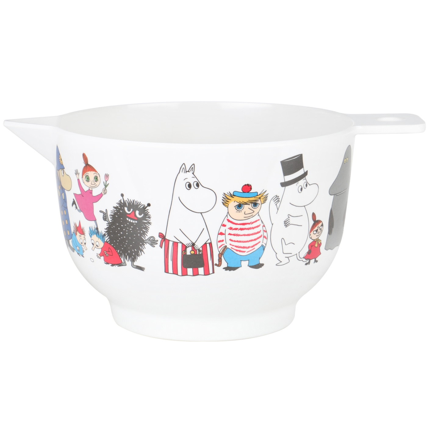 Längs skålens utsida löper en rad med välbekanta Muminfigurer i klara färger.
