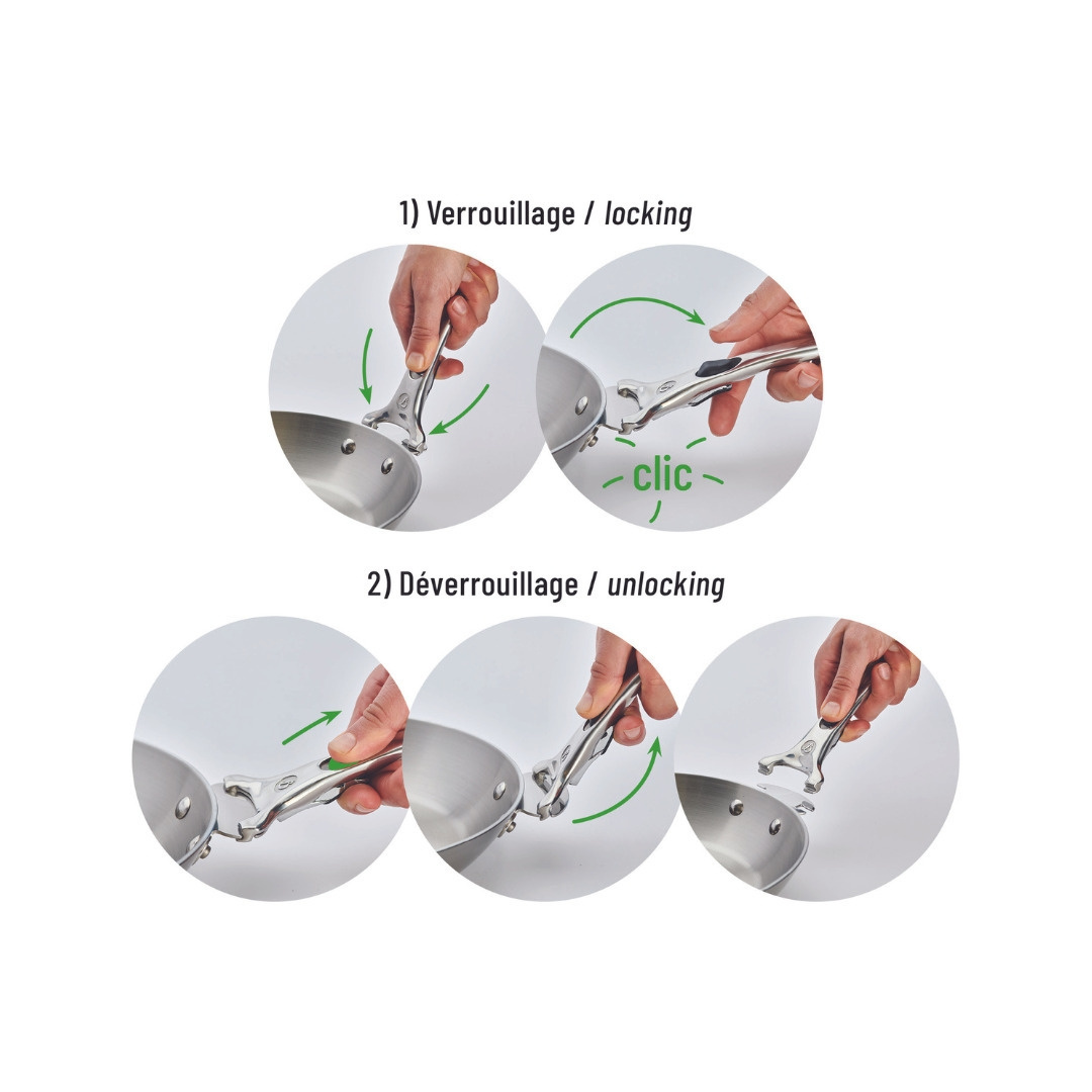 The De Buyer detachable handle is as ergonomic as it is beautiful. Simple attachment mechanism that allows the handle to be used with just one hand. The stainless steel handle fits De Buyer LOQY series pans.