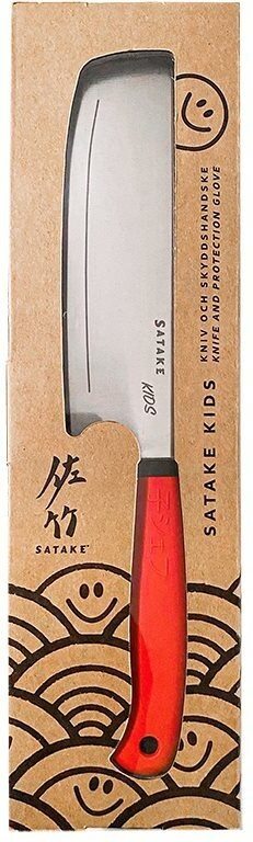 Satake Kids kniv och skärhandske. Ta med barnen in i köket! Det är roligt och lärorikt och får barnen entusiastiska över nya smaker och kulinariska äventyr. Kniven är en mycket vass kvalitetskniv och ska hanteras med försiktighet och respekt. Kniven är ingen leksak, och en vuxen måste alltid vara närvarande vid användning.