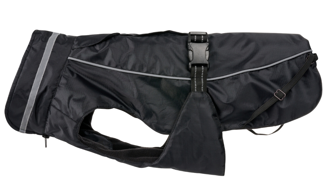 Waterproof outer layer protects against water and wind. Soft fleece inside and the insulated layer help keeping your dog warm. Adjustable leg strings and stomach belt for better fitting. Adjustable double zipper allows the dog to wear a harness under the coat. Reflective tape and piping make the dog more visible during night walk. Machine washable at 30 degrees Celsius. Fashionable Danish design