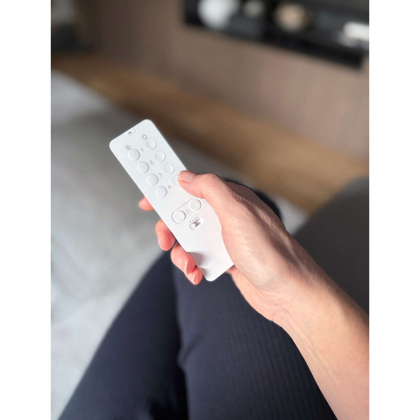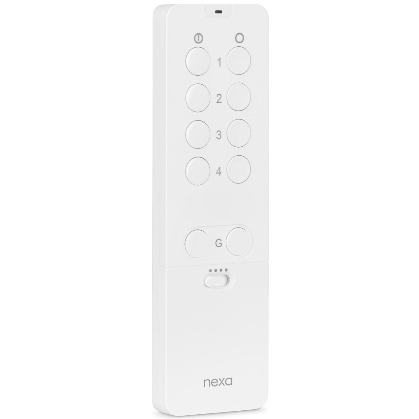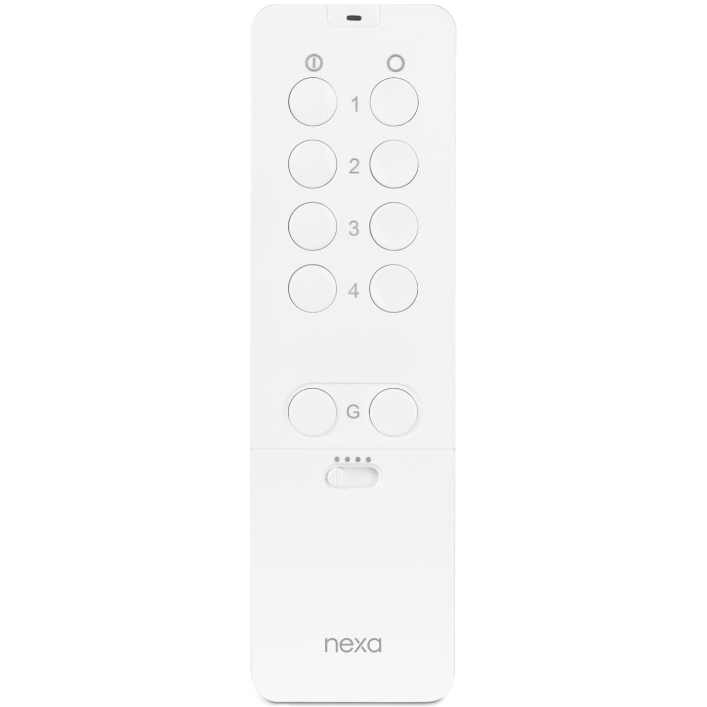 Styr mottagare i System Nexaoch System Nexa2. Glidskydd på undersidan förhindrar att fjärrkontrollen glider vid knapptryckning. Styr upp till 16 stycken mottagare individuellt, På/Av/DIM. Gruppfunktion, "Alla På" / "Alla Av" –styr alla enheter samtidigt.