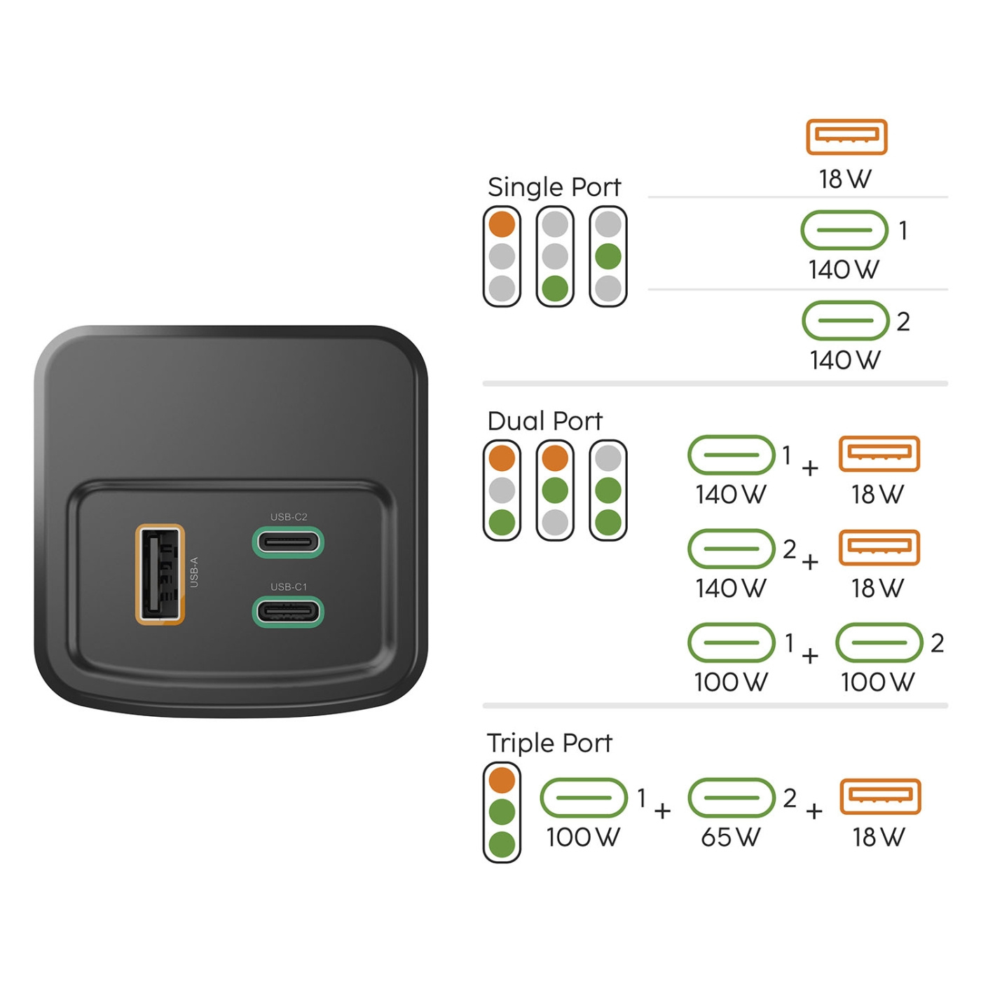 - 2x USB-C and 1x USB-A ports