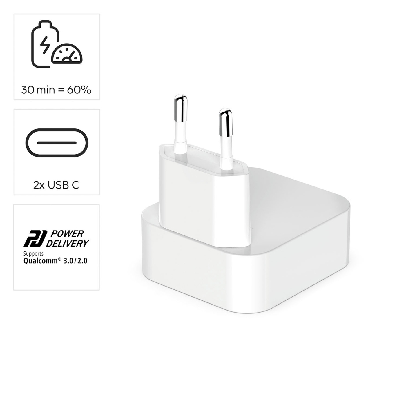Experience rapid charging with the 2xUSB-C GaN PD 40W charger, designed to power your devices quickly and efficiently. This powerful charger supports Power Delivery up to 40 watts and is compatible with Qualcomm Quick Charge technology, ensuring your devices are charged to 60% in just 30 minutes. Ideal for the latest smartphones, which often do not include chargers, this device is perfect for those on the go.