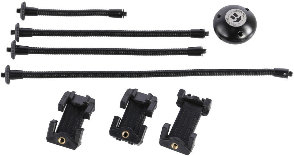 The sales kit comes with four folding arms: 1 x 10 cm, 2 x 20 cm and 1 x 30 cm and three smartphone holders.