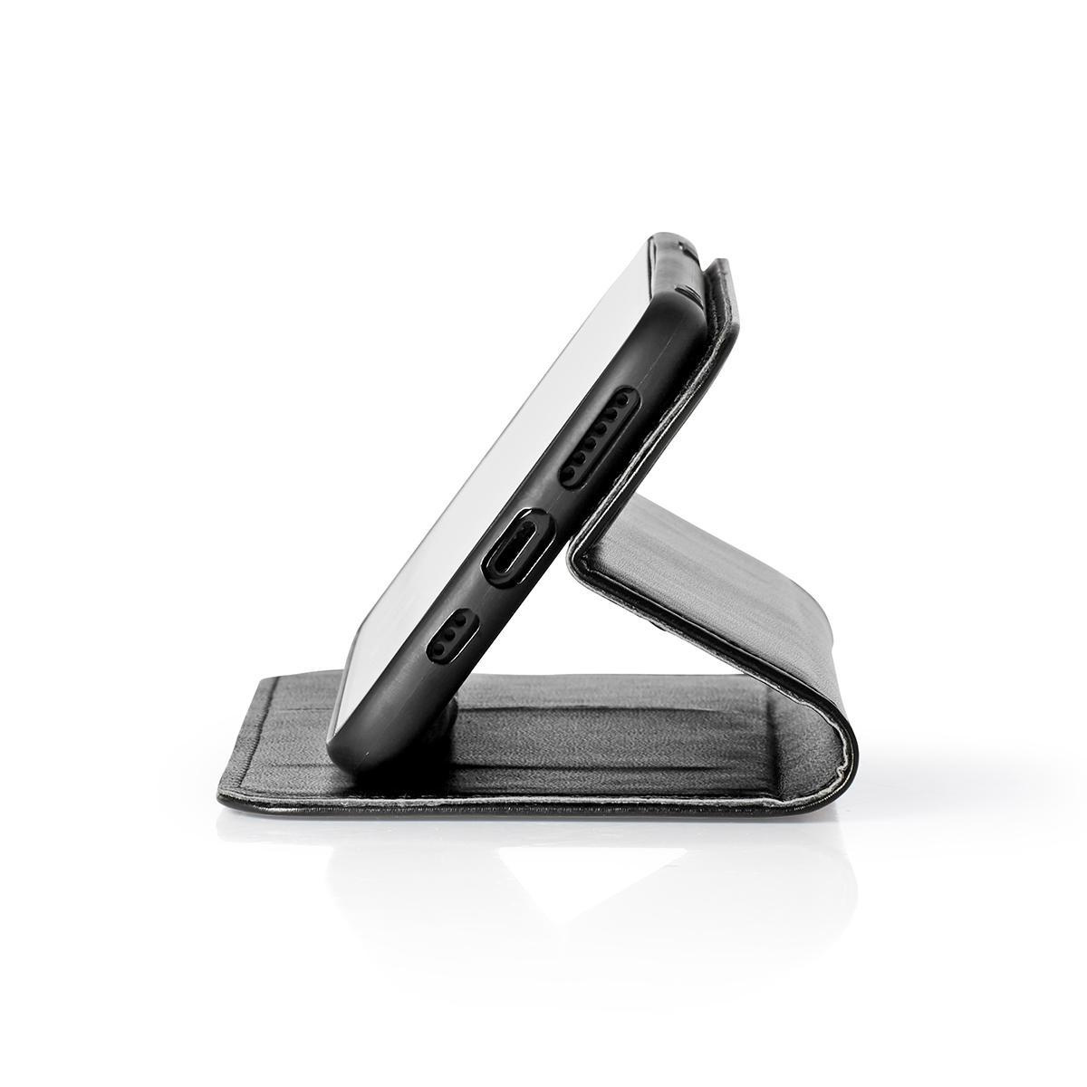 The booklet flap has a slot to store bank cards. Next to that it also has a stand function allowing you to watch videos or photos.
