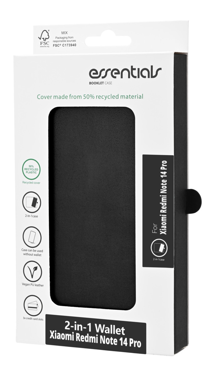 Essentials Xiaomi Redmi Note 14 Pro PU-plånbok, avtagbar, 3 kort, svart