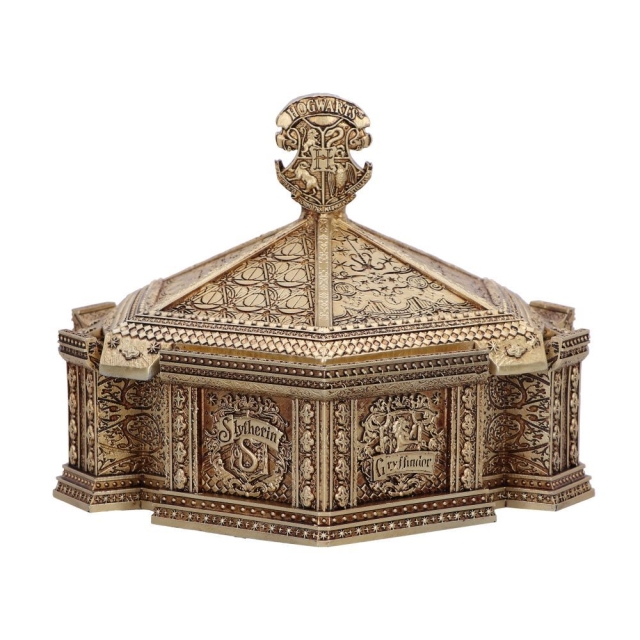 Magic is waiting for you with this Officially Licensed Harry Potter Hogwarts Trinket Box. Featuring the four Hogwarts houses around the outside, along with incricate detailing based on the Deathly Hallows and Hogwarts. Cast in the finest resin before being finished in bronze, this Hogwarts Trinket box is made for keeping all your secret treasures safe.