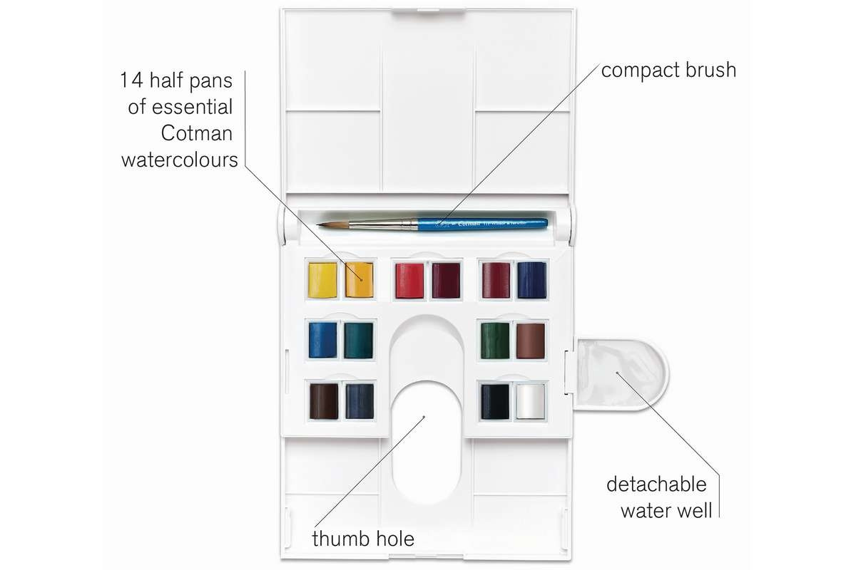 Den här lätta lådan i fickformat är perfekt för utomhuskonstnären. Setet erbjuder ett antal blandningsytor, en utdragbar palett och en medium skål. Den innehåller: 14 x halvpannor Cotman Watercolor 1 x Cotman Series 111 Watercolor pensel.