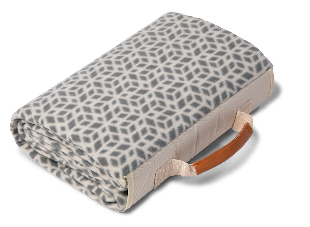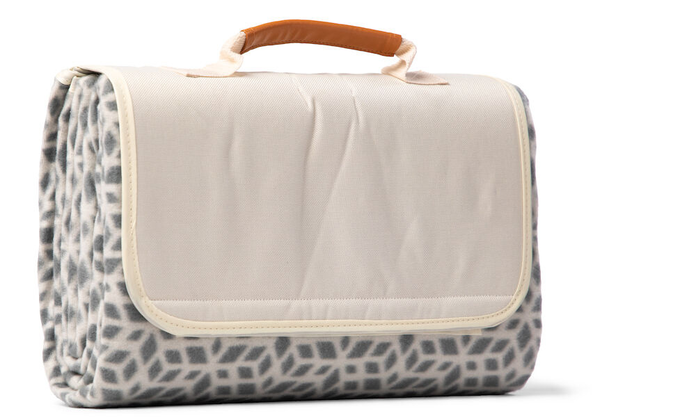Filten rullas enkelt och smidigt ihop och kan sedan bäras i det mjuka bärhandtaget. Tillverkad av återvunnet material från PET-flaskor med handtag i kraftig bomull och konstläder.