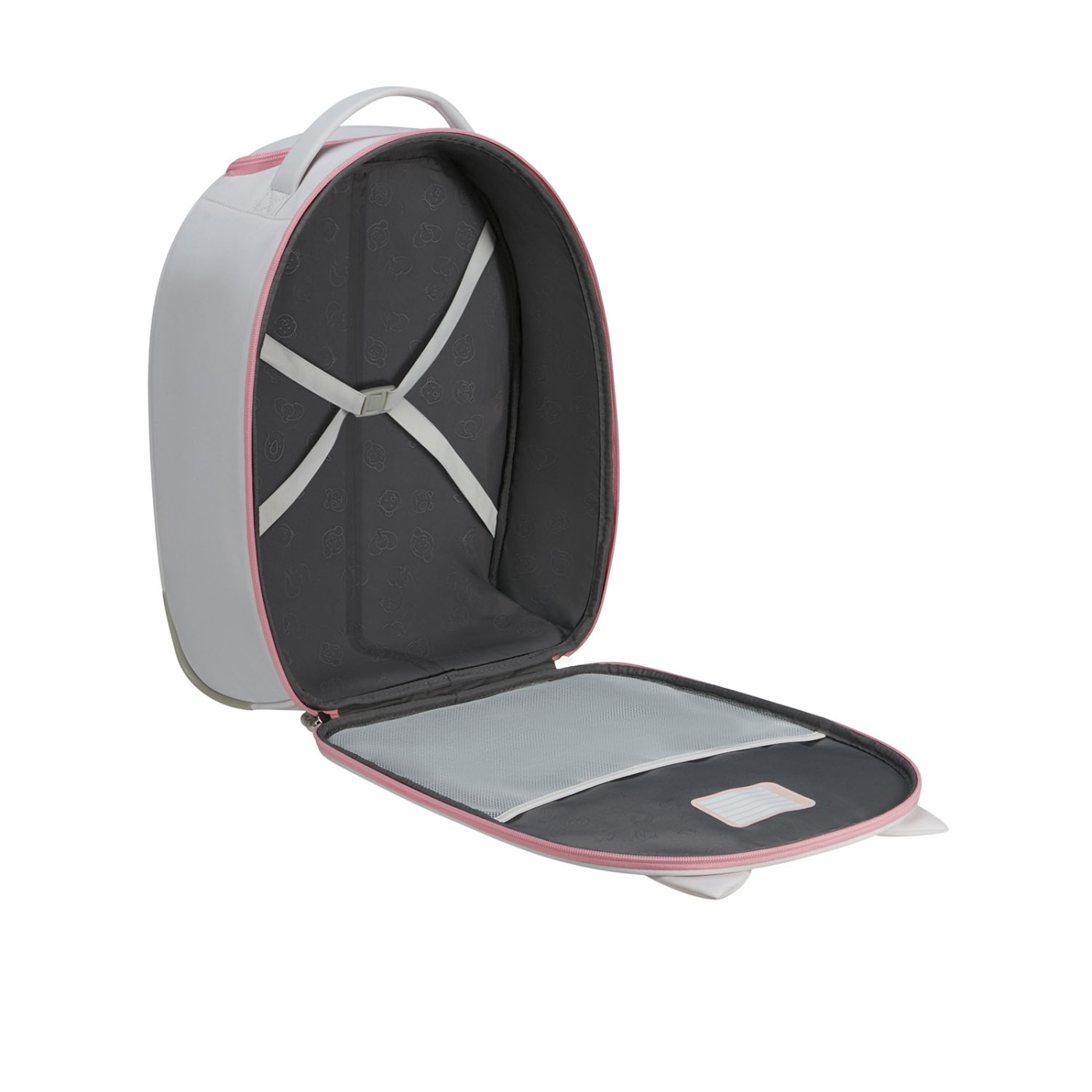 The soft bag design includes a pull handle with two rails and an integrated wheel system for easy maneuverability. The charming design features soft 3D details, making it a delightful lifestyle collection for children. The upright bag has matching lining and smoothly integrated wheels, ensuring a seamless travel experience.