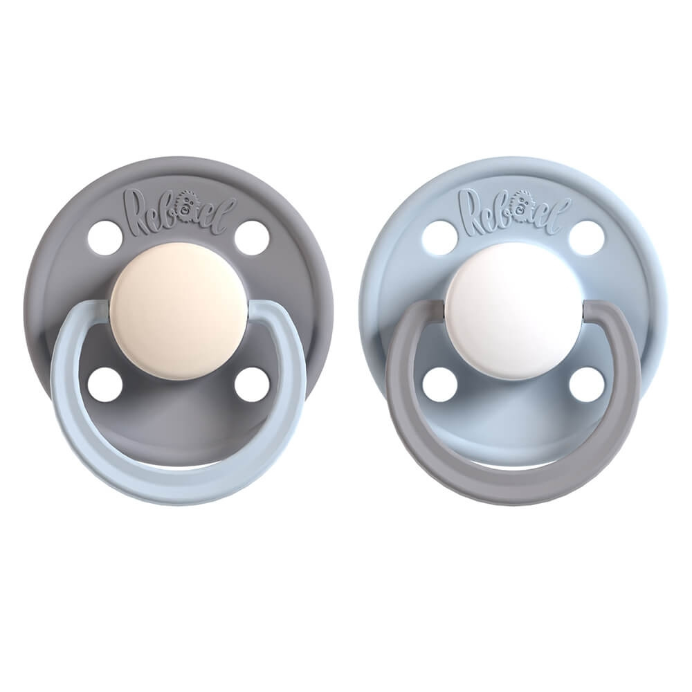 Match each outfit with a pacifier from Rebael.The pacifiers with round nipples are made of 100% natural rubber latex, without added chemicals.