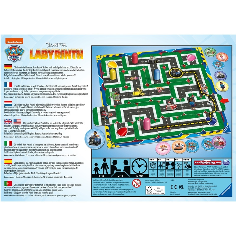 - Innehåll: 1 spelplan, 17 fyrkantiga labyrintdelar, 12 runda spelmarker, 4 spelpjäser