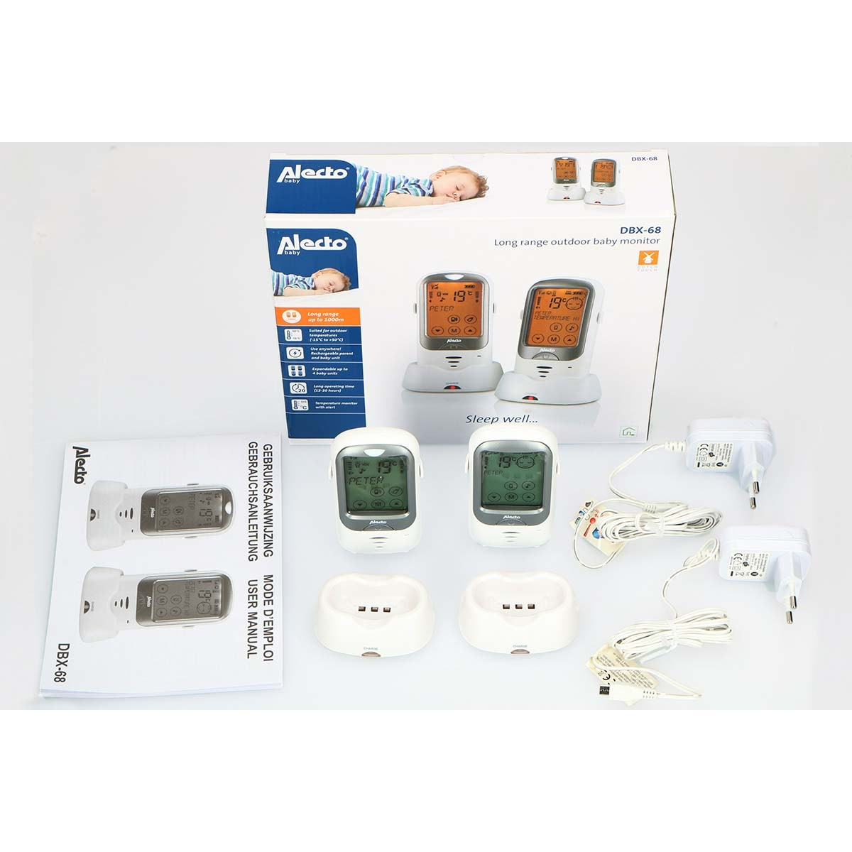 The DBX-68 provides a rechargeable battery not only in the parent unit, but also in the Baby unit. Ideal if you want to leave the pram outside when your baby is sleeping to enjoy the healthy air, or if you are on a camping trip. The DBX-68 is your perfect companion.
